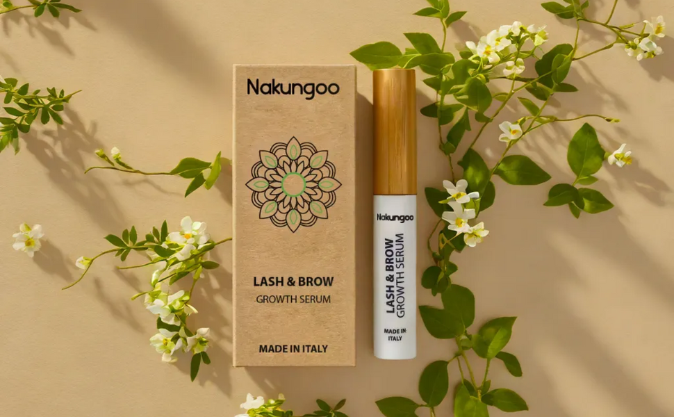 Nakungoo Lash & Brow Growth Serum alarga, espesa y fortalece las pestañas y cejas con una fórmula natural, vegana y suave.