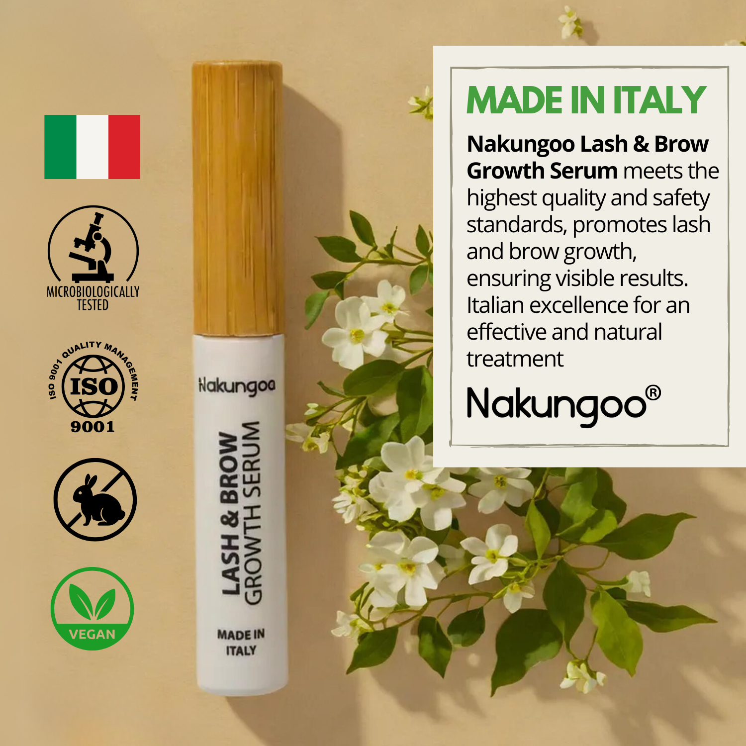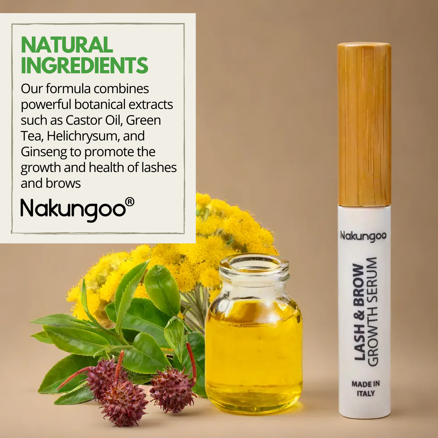 Natural & Powerful Formula: Made in Italy with natural extracts like helichrysum, green tea, and ginseng, Nakungoo Lash & Brow Growth Serum strengthens, lengthens, and thickens lashes and brows for a healthy, revitalized look.