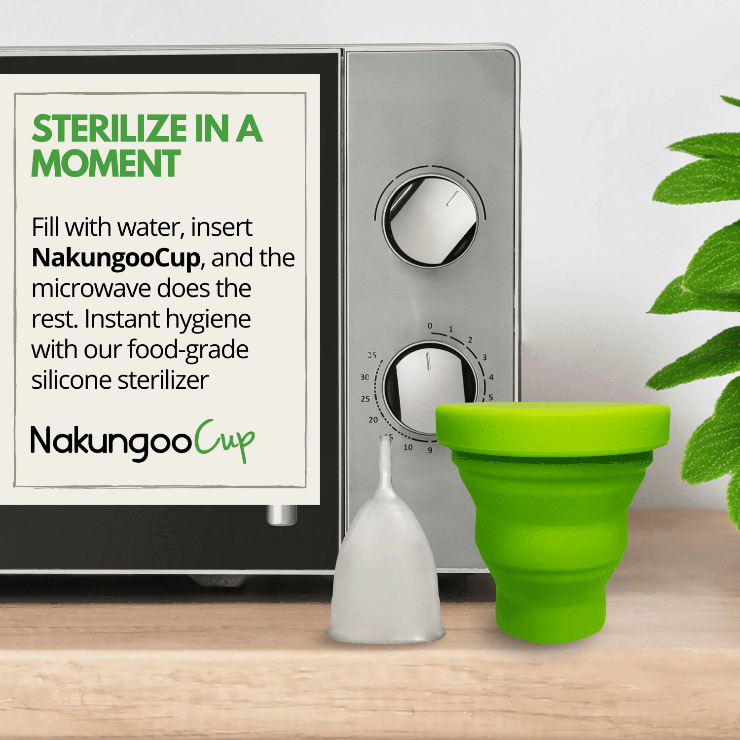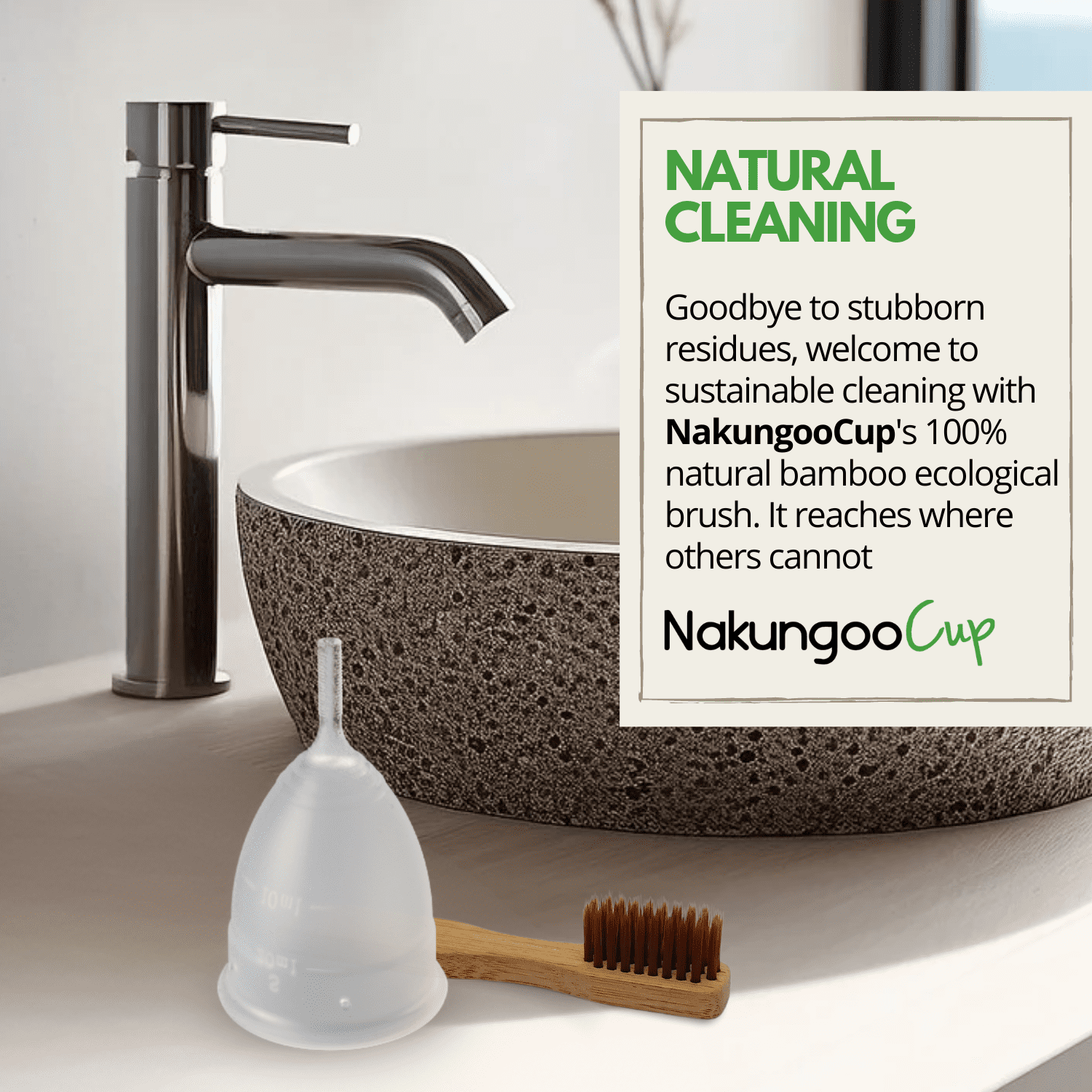 NakungooCup can be cleaned with the included bamboo brush and sterilized using the foldable microwave container. Simply rinse the cup between every use and when you are done with your period rinse it and place it in the container with water, and microwave it for a few minutes to sterilize.